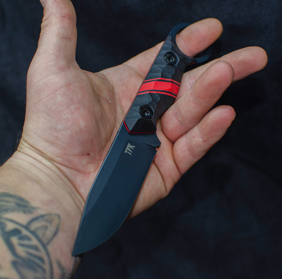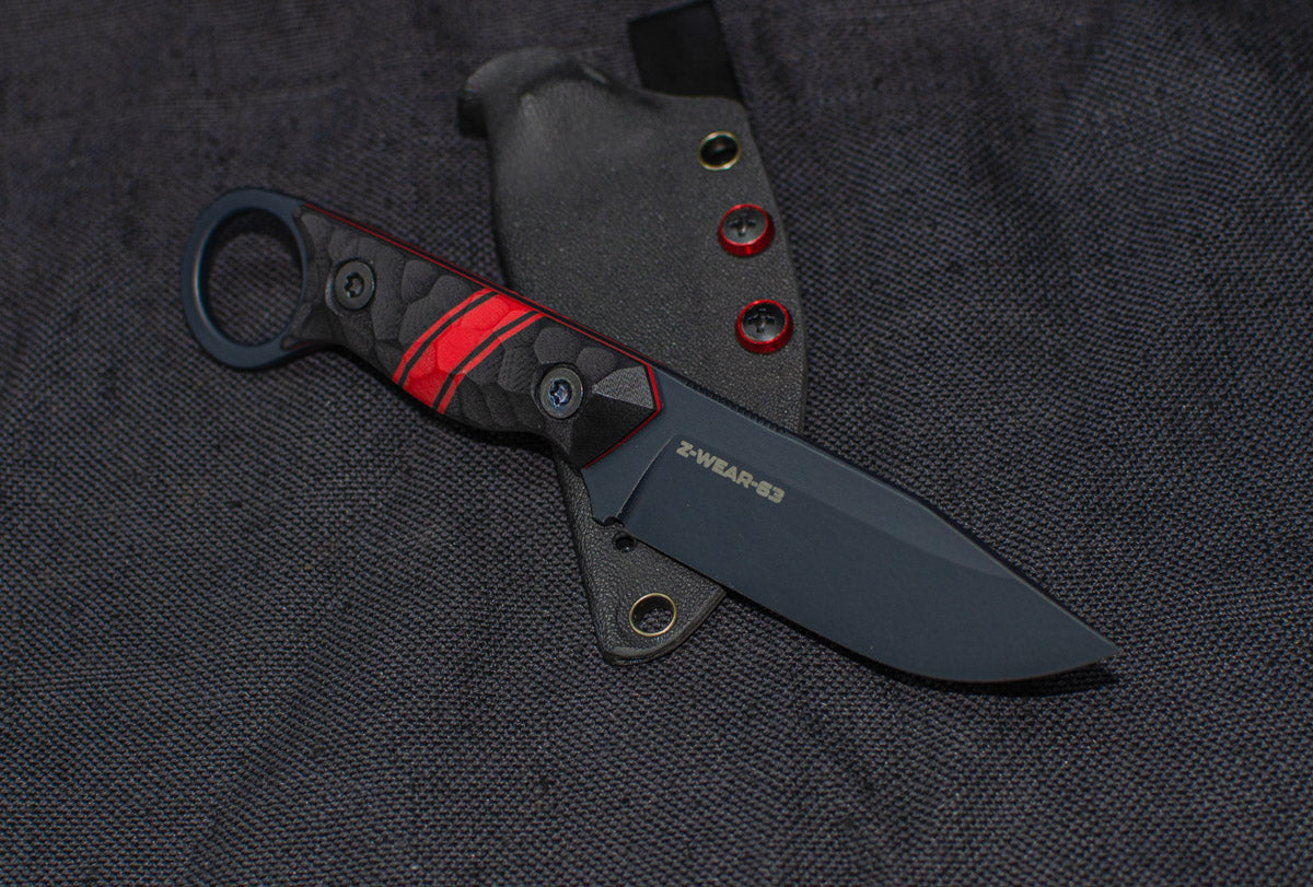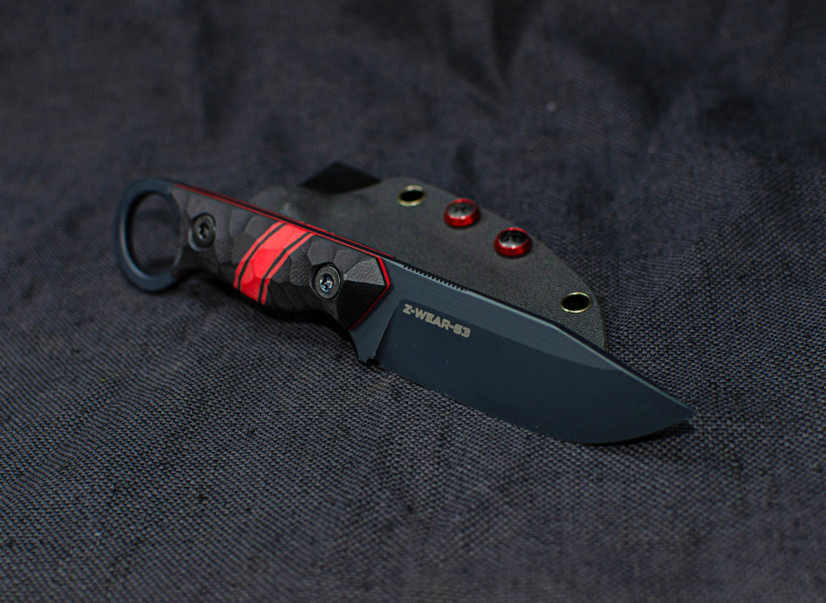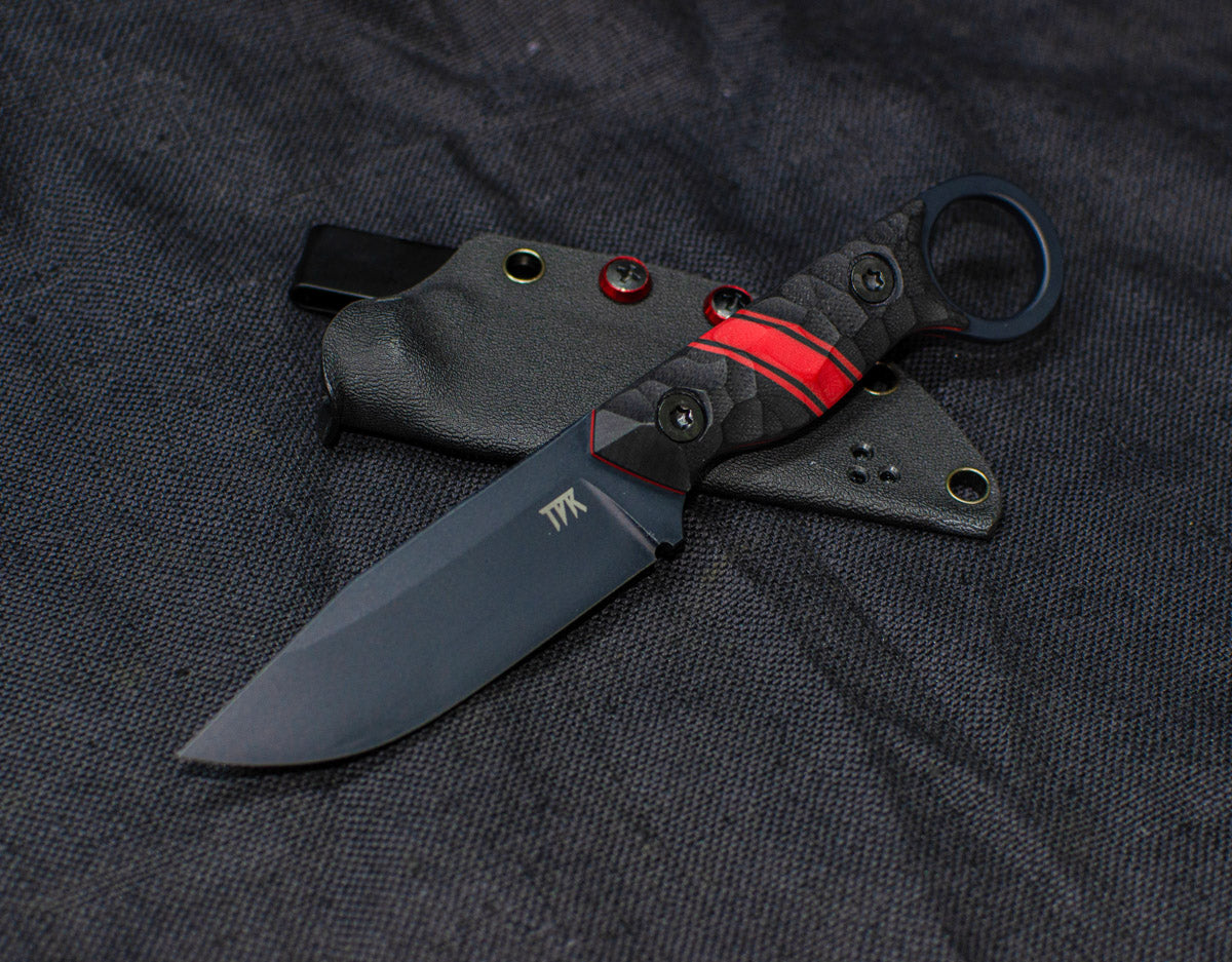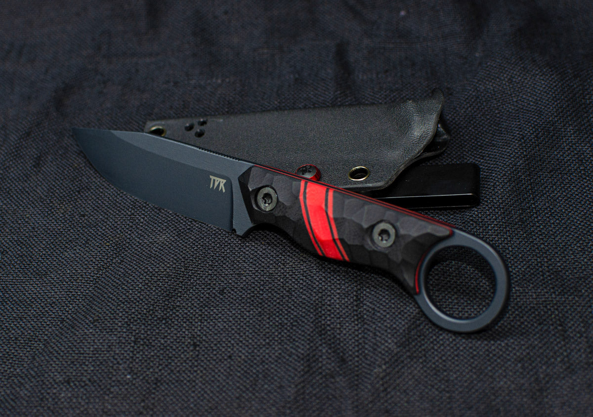 Aggressive drop point knife with a ring hook handle in an EDC package.